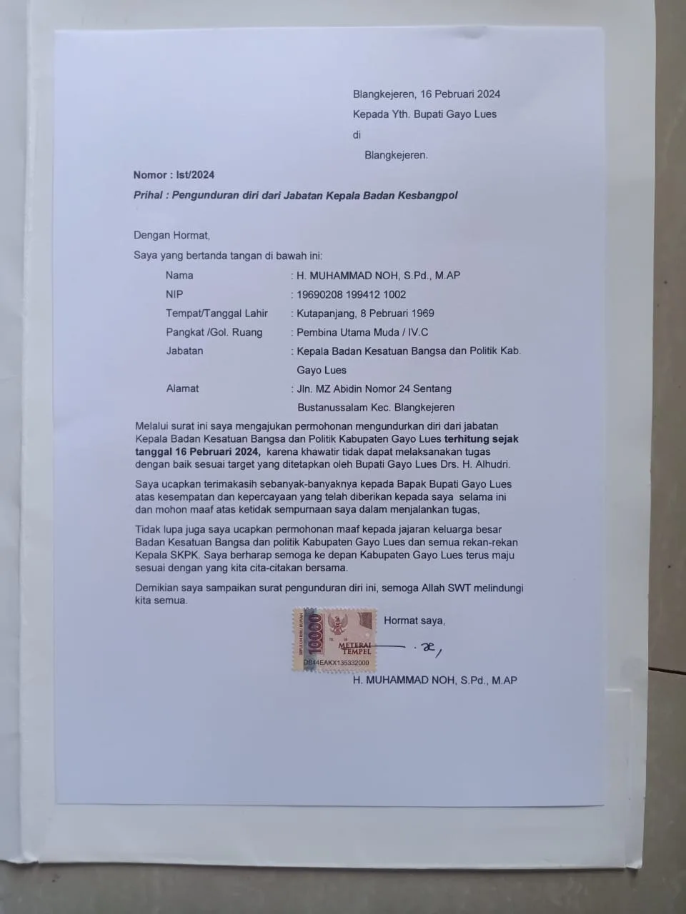 “Saya ucapkan terima kasih sebanyak-banyaknya kepada (Pj) Bupati Gayo Lues atas kesempatan dan kepercayaan yang telah diberikan kepada saya selama ini dan mohon maaf atas ketidaksempurnaan saya dalam menjalankan tugas,” kata Mohammad Noh dalam surat pengunduran diri di atas tanda tangan dan materai Rp10.000,- tersebut.