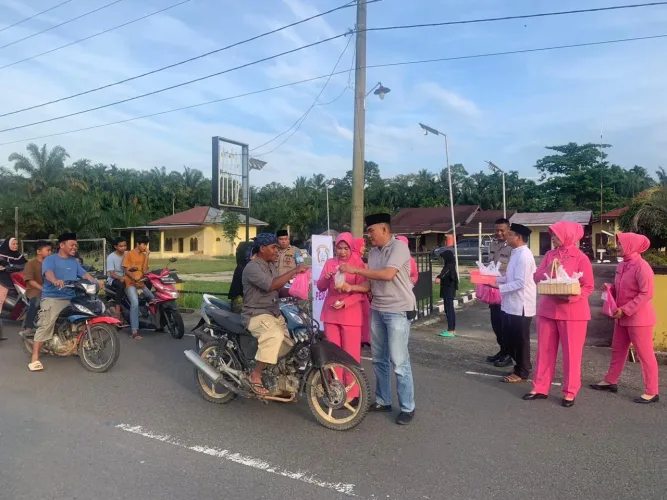 Polsek XIII Koto Kampar melaksanakan kegiatan Bhayangkari Peduli dengan membagikan makanan berupa Takjil Gratis kepada masyarakat yang melintas di depan Mapolsek Jalan Lintas Pekanbaru-Batu Bersurat, XIII Koto Kampar, Kabupaten Kampar.