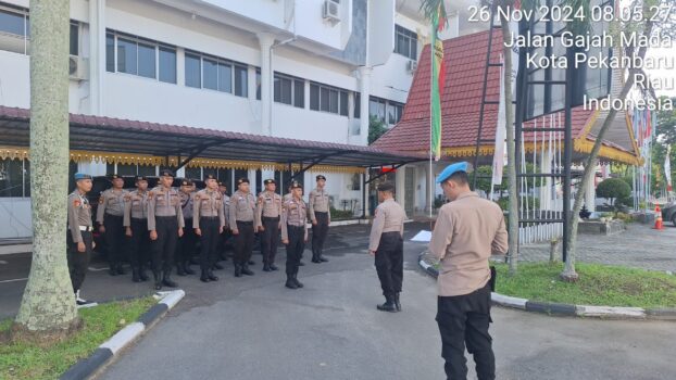 PEKANBARU – Sebelum melaksanakan kegiatan pengamanan kantor penyelenggara Pilkada yakni Kantor KPU Riau, puluhan personel ikuti apel pagi di halaman Kantor KPU Provinsi Riau, Selasa (26/11/2024).