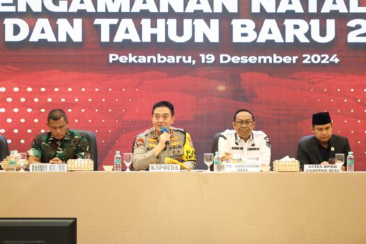 PEKANBARU – Polda Riau bersama Forkopimda dan Polres jajaran menggelar rapat koordinasi lintas sektoral persiapan pengamanan perayaan Natal 2024 dan Tahun Baru 2025 di Grand Elite Hotel Pekanbaru, Kamis (19/12/2024).