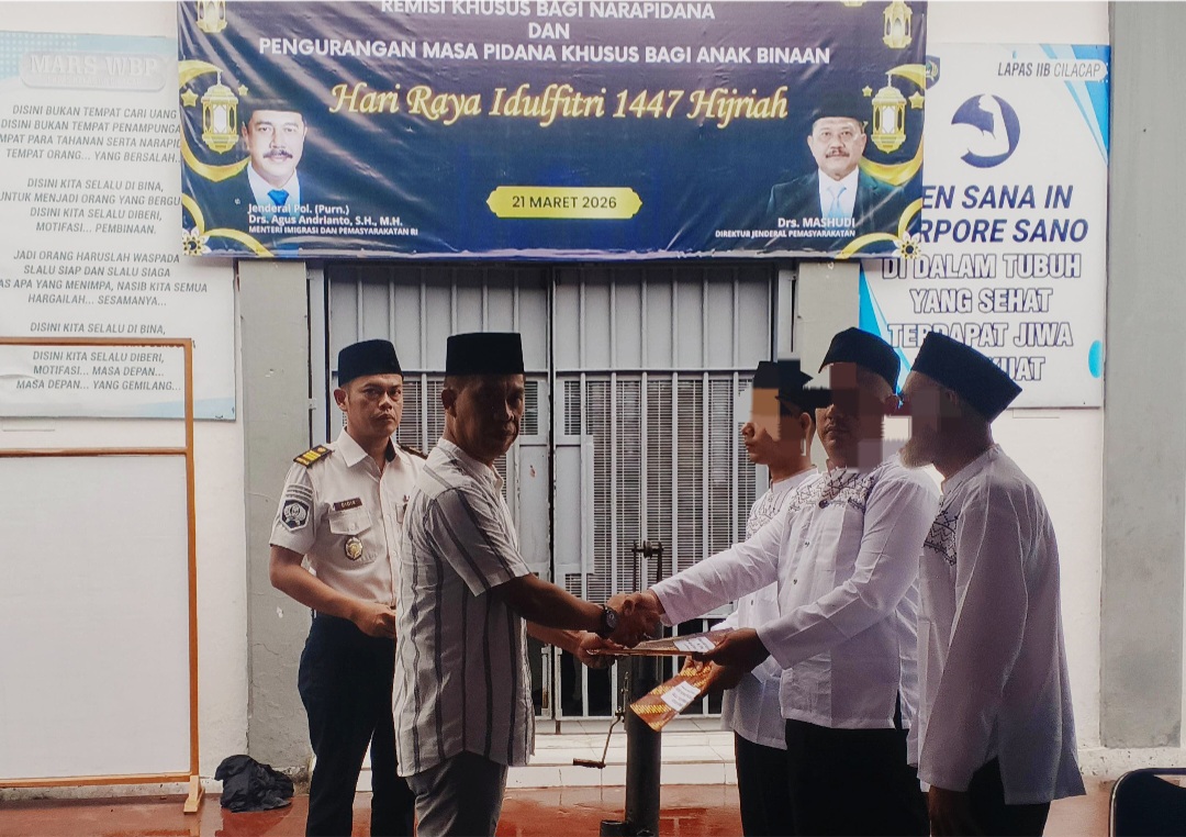 CILACAP, Haloterkini.com – Lembaga Pemasyarakatan (Lapas) Kelas IIB Cilacap serahkan Remisi Khusus (RK) Hari Raya Idul Fitri 1447 Hijriah Tahun 2026 kepada 356 orang narapidana yang telah memenuhi persyaratan administratif, mengikuti pembinaan, berperilaku baik selama menjalani masa pidana. Penyerahan dilakukan seusai pelaksanaan Shalat Idul Fitri 1447 Hijriah di Lapangan Serbaguna Lapas Kelas IIB Cilacap, (21/03).